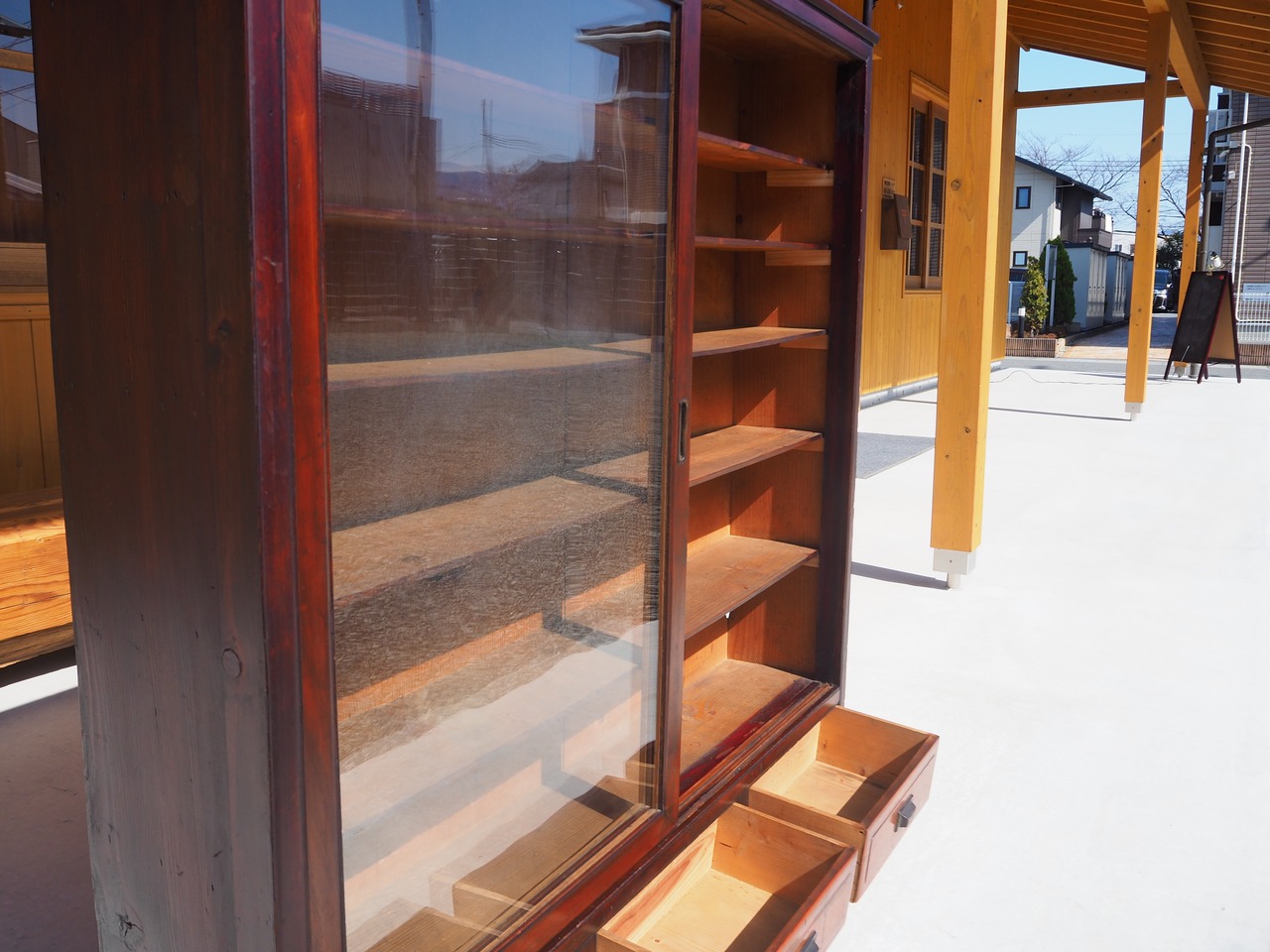 前面はガラス扉仕様のため、食器や本、雑貨などを見せながら収納でき、内部は棚板付きで