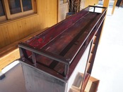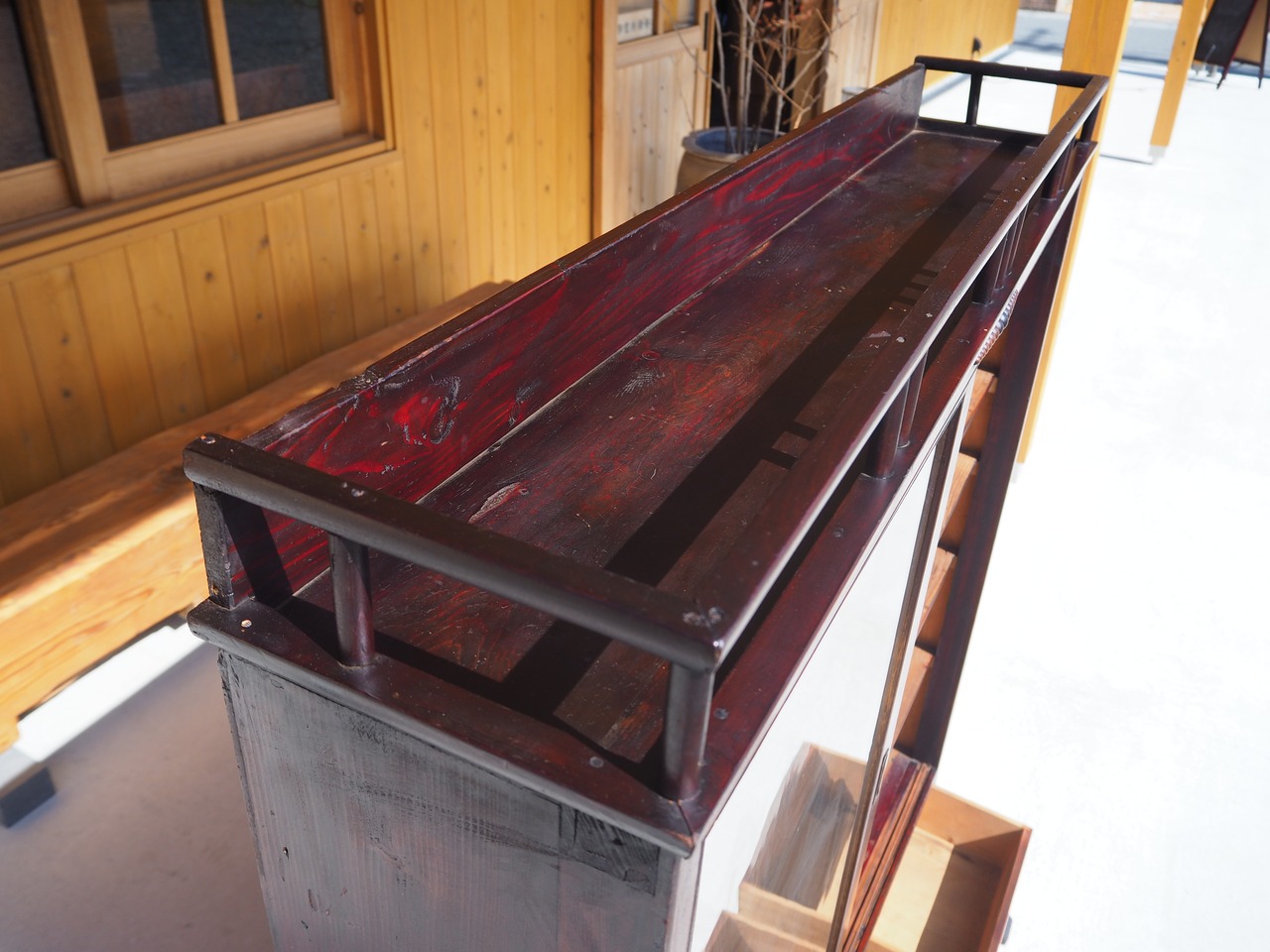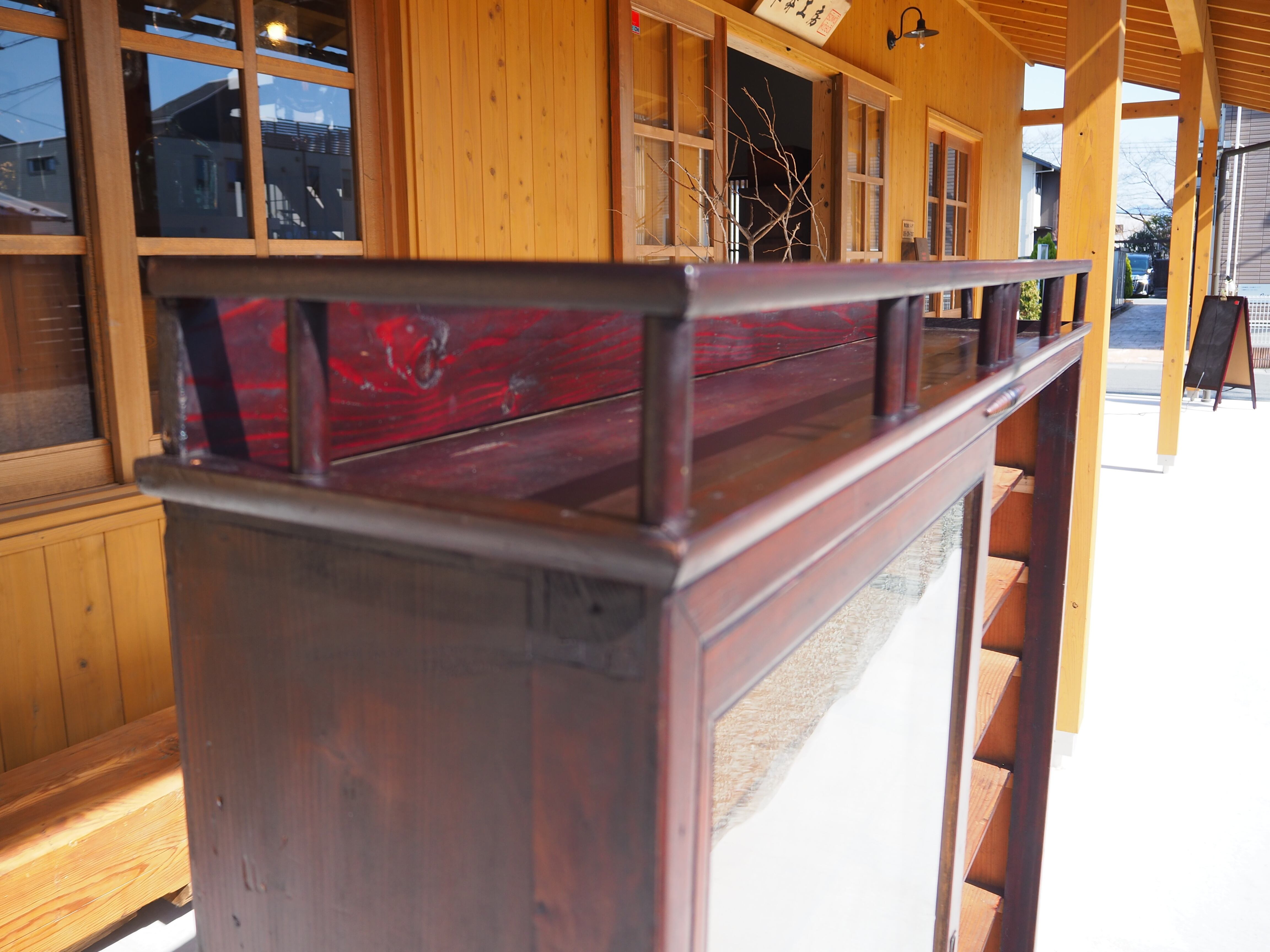 上部には立ち上がりのある飾り棚が設けられており、置いたものが後ろに落ちにくい