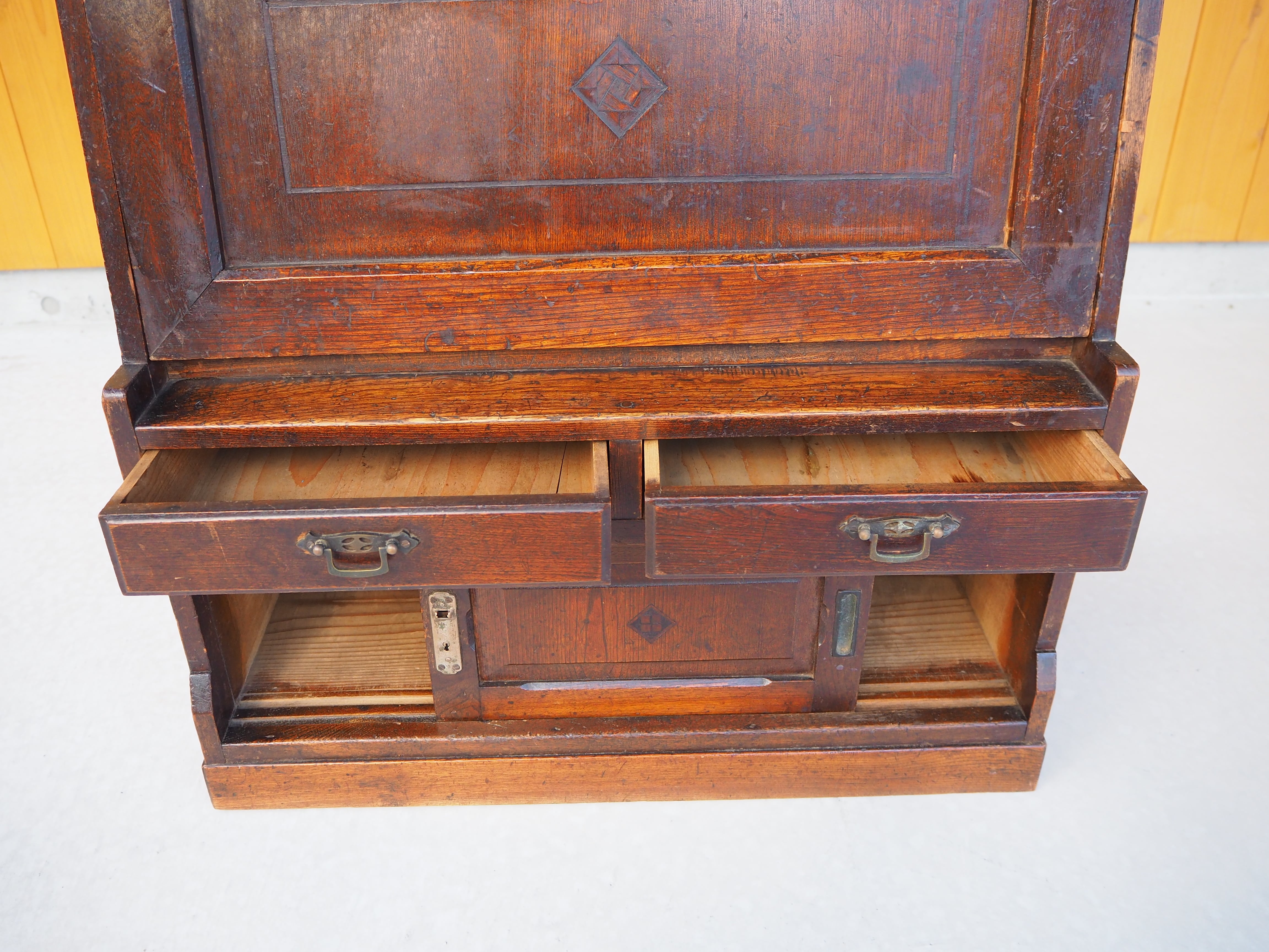 小ぶりで木の温もりがあり、ライティングビューローのような作りの戸棚です。引き戸や開き戸などに見られる埋め込みの模様が印象的で、全体の使い込まれた感が味となっています。引き戸の差し込み金具はなくカギも付いていません。開き戸の上部の丸いツマミ金具は失われていたので手作りしました。